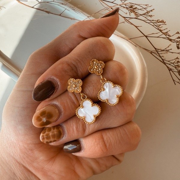 Aro pasante con trébol blanco y brillitos - acero dorado